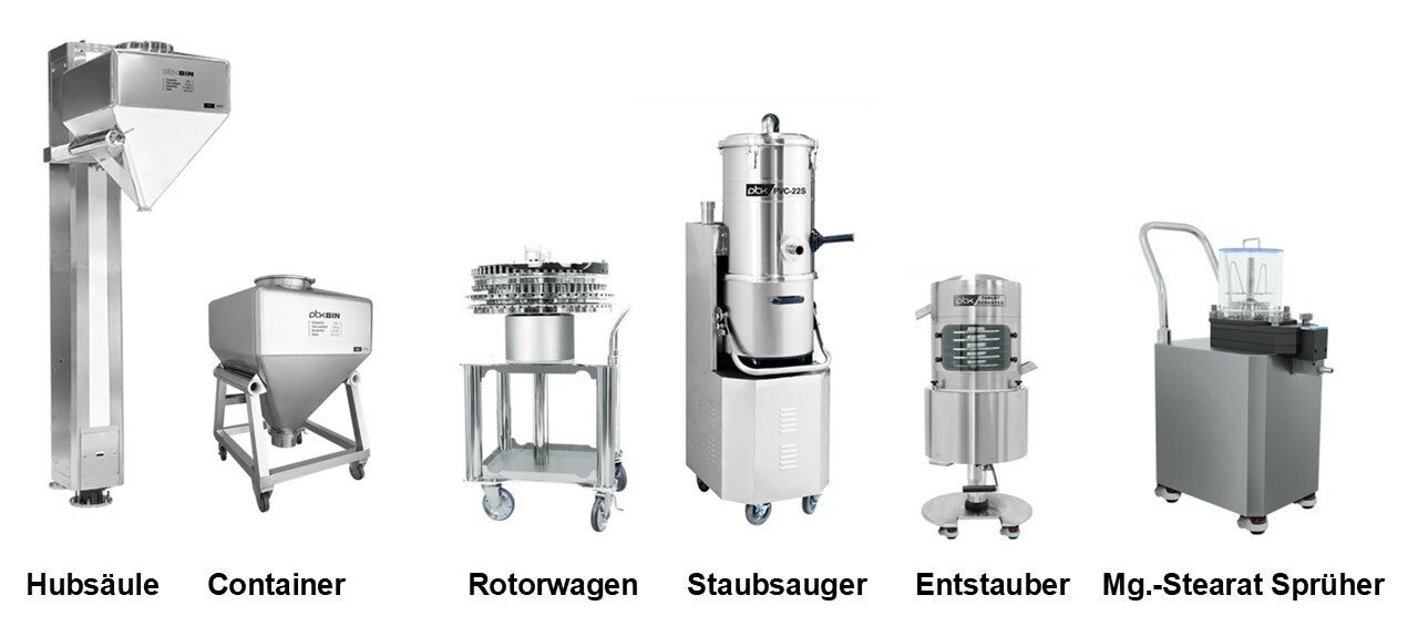 Vom Containerhubsäule für unsere Container (150l bis 1000l), Pulverbeschickung und Tablettenenstaubung bieten wir umfassende Gesamtlösungen rund um die Tablettenpresse